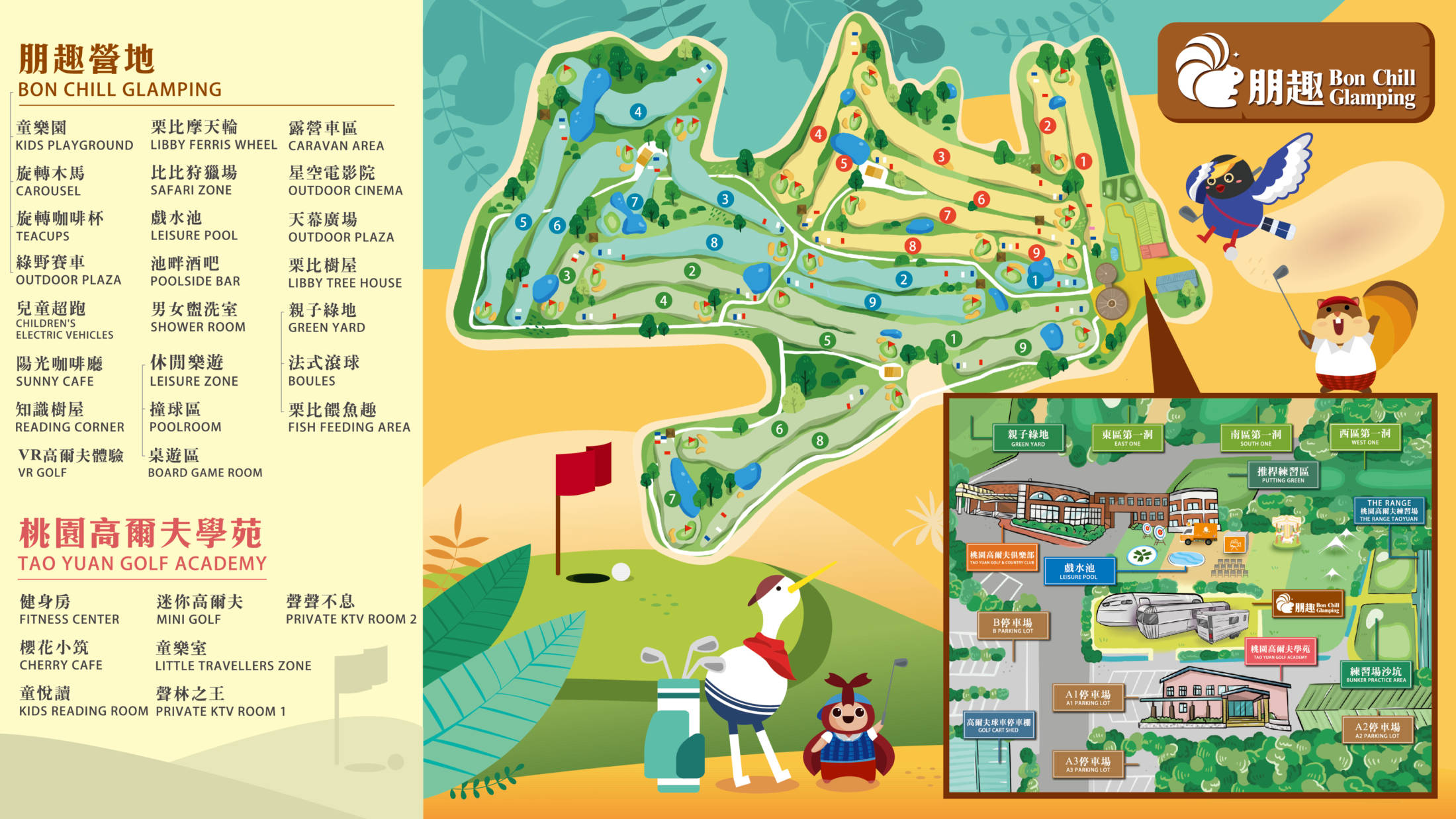 “Bon Chill” is an all-new glamping experience brand under the Cosmos Hotels & Resorts Group. The name was inspired by wild and cute squirrels in the area, and is derived from the Taiwanese pronunciation for squirrels, “phòng-tshí”. As the site is located next to the Taoyuan Golf Course, the two attractions have been combined to form the theme “Play Golf, Stay at Bon Chill”. Combined with the most trendy glamping luxury campervan experience, we welcome guests to experience natural ecology, blue skies and lush greenery on our grounds, and provide comfortable rest and dining through all-inclusive services, exclusive squirrel smart butler services, stunning poolside bar and an outdoor movie theater under the starry skies. An outdoor kid’s playground and a golf experience is also available. Come stay at Bon Voyage, where we create endless imaginations of luxury camping and memorable vacations.
